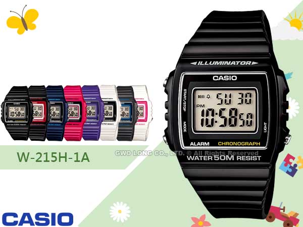 CASIO方形數字錶W-215H新色登場,大型的液晶錶面讓時間與日期更易閱讀,搭載防水50米、LED背光照明、1/100秒計時碼表、每日鬧鈴等功能。