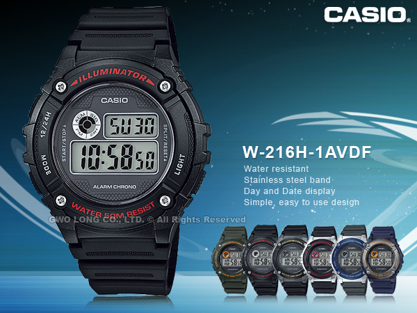CASIO數字錶款W-216H系列,推出全新色系─黑、藍與墨綠等三種選擇,搭配金屬質感錶殼,打造休閒運動時尚魅力!具備防水50米、1/100秒計時碼表、LED背光照明、全自動月曆等多項功能。
