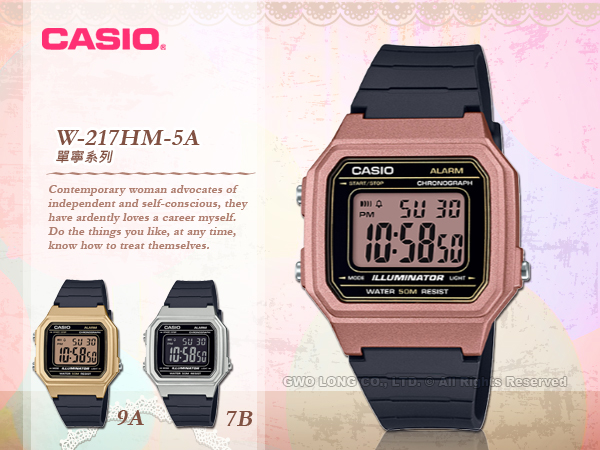 CASIO方形數字錶款推出全新W-217HM系列,外觀為復古的方型設計搭配大型的液晶錶面讓時間與日期更易閱讀,分別以金、銀、玫瑰金三色錶殼搭配黑色樹脂錶帶,並搭載防水50米、LED背光照明、1/100秒計時碼錶、每日鬧鈴等功能。