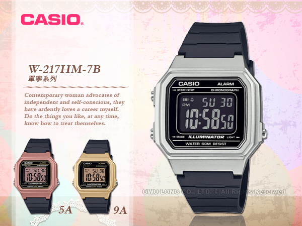 CASIO方形數字錶款推出全新W-217HM系列,外觀為復古的方型設計搭配大型的液晶錶面讓時間與日期更易閱讀,分別以金、銀、玫瑰金三色錶殼搭配黑色樹脂錶帶,並搭載防水50米、LED背光照明、1/100秒計時碼錶、每日鬧鈴等功能。