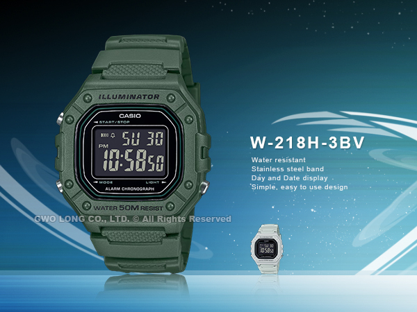 W-218H-3B CASIO 電子錶 深綠 反液晶 膠質錶帶 防水50米 W-218H