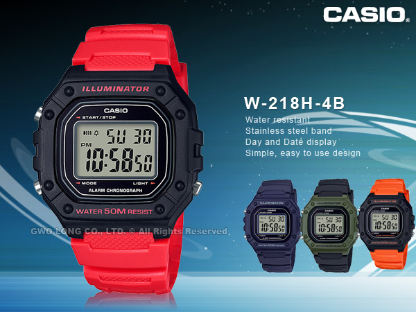 CASIO推出全新W-218H系列,外觀為復古的方型錶殼設計,顏色上提供多種色系選擇,包含黑、藍、綠X黑、黑X紅、黑X橘共5種顏色選擇,而功能上,內建1/100秒碼錶、每日鬧鈴、LED 背光照明、防水50米…等機能。