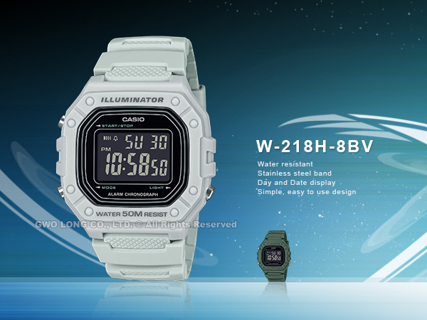 W-218H-8B CASIO 電子錶 灰白 反液晶 膠質錶帶 防水50米 W-218H