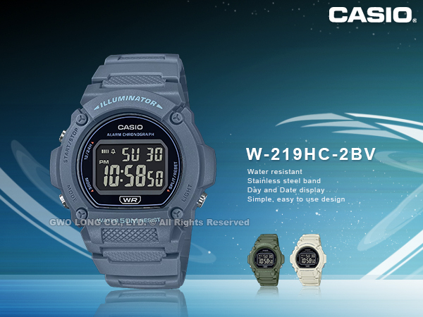 新款W-219H系列推出新色,運動機能性與實用功能兼具。7 年的電池壽命滿足實用需求,不必時時擔心需換電池,且具備 50 公尺防水性能,遇到下雨也能安心無虞。LED 燈照明讓您在黑暗中也能輕鬆判讀,便利的鬧鈴與碼錶功能讓您運動不間斷。