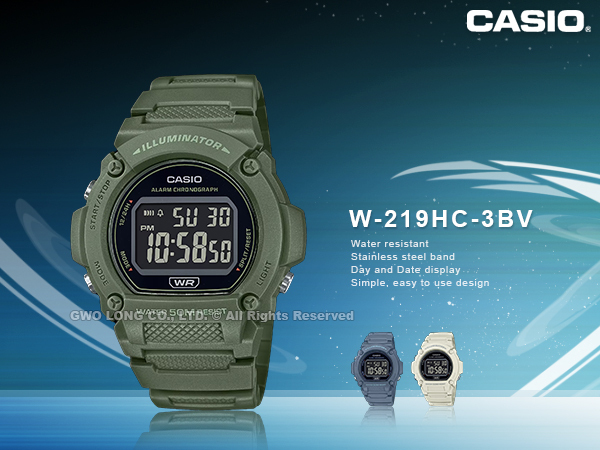 W-219HC-3B CASIO 電子錶 墨綠色 膠質錶帶 防水50米 LED燈光 鬧鈴 碼錶 W-219H