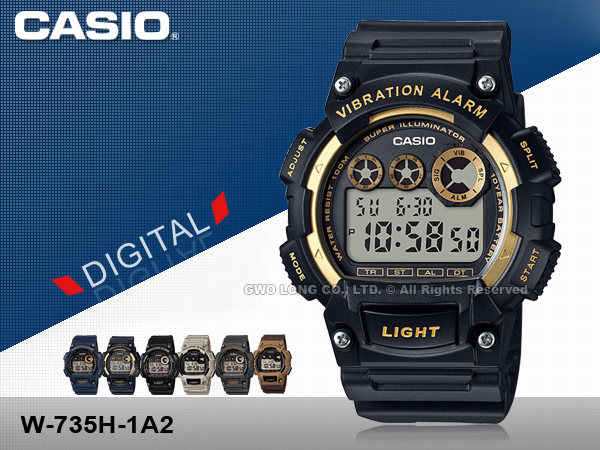 CASIO數字錶款W-735H系列具有震動提示功能,在不宜有聲響的環境場合中也不會錯過重要的時間提醒。另搭載超亮LED照明、兩地時間、1/100秒計時碼表、倒數計時、每日鬧鈴(可選擇聲響或是震動提示)、防水100米等功能。