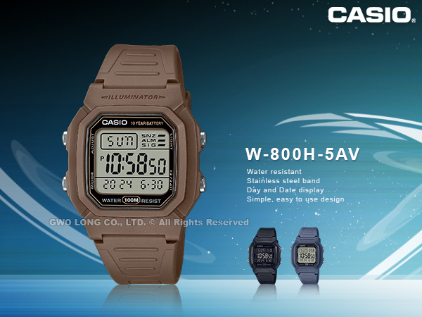 W-800H-5A CASIO 電子錶 深棕色 膠質錶帶 防水100米 LED背光 鬧鈴 碼錶 W-800H