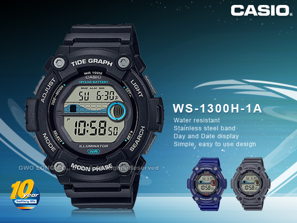 WS-1300H-1A CASIO 運動電子錶 樹脂錶帶 十年電力 月象 潮汐圖 LED 防水100米 WS-1300H