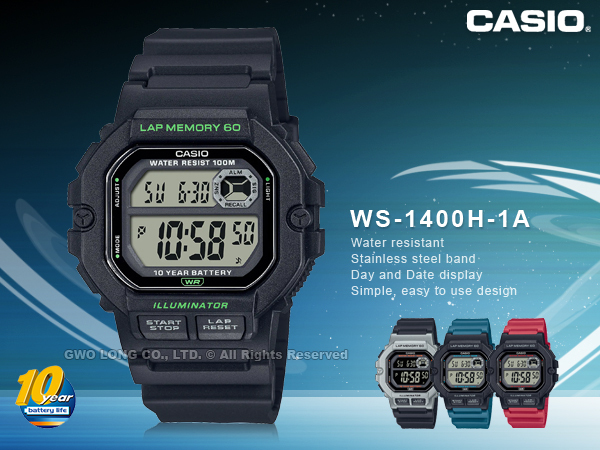 WS-1400H-1A CASIO 電子錶 男錶 運動訓練 十年電力 樹脂錶帶 防水100米 WS-1400H