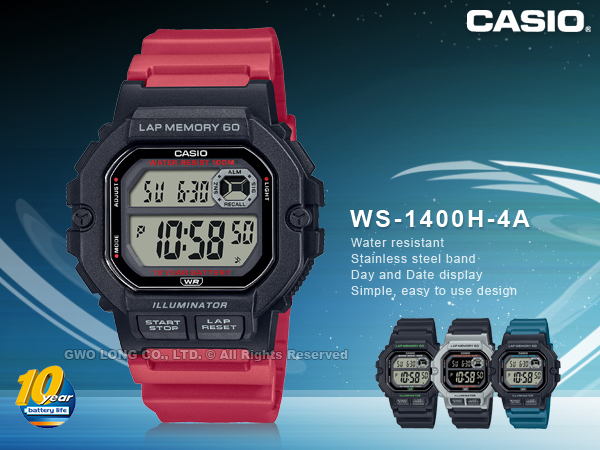 WS-1400H-4A CASIO 電子錶 男錶 運動訓練 十年電力 樹脂錶帶 防水100米 WS-1400H