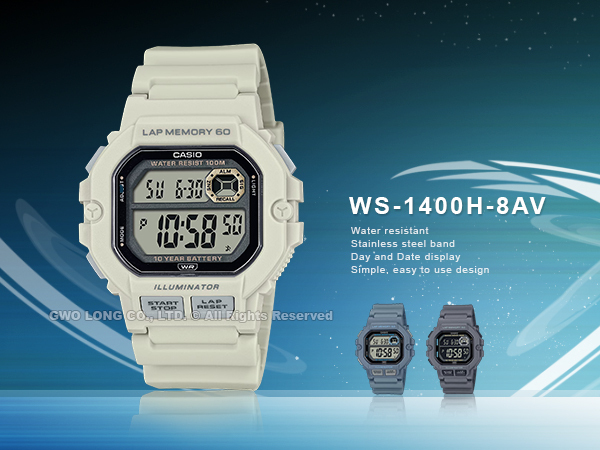 WS-1400H-8A CASIO 電子錶 米白色 運動訓練 60圈記憶 膠質錶帶 防水100米 WS-1400H