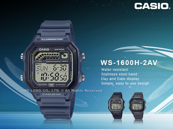 WS-1600H-2A CASIO 電子錶 深藍 多功能計時器 膠質錶帶 防水100米 LED背光 鬧鈴碼表 WS-1600H