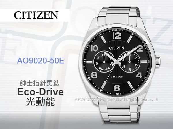 AO9020-50E CITIZEN 光動能指針男錶 不鏽鋼錶帶 黑色錶面 防水100米