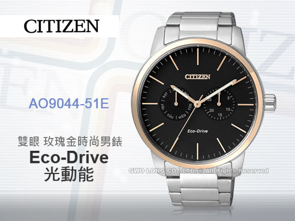 AO9044-51E CITIZEN 三眼男錶 不鏽鋼錶帶 黑色X玫瑰金鏡面 光動能