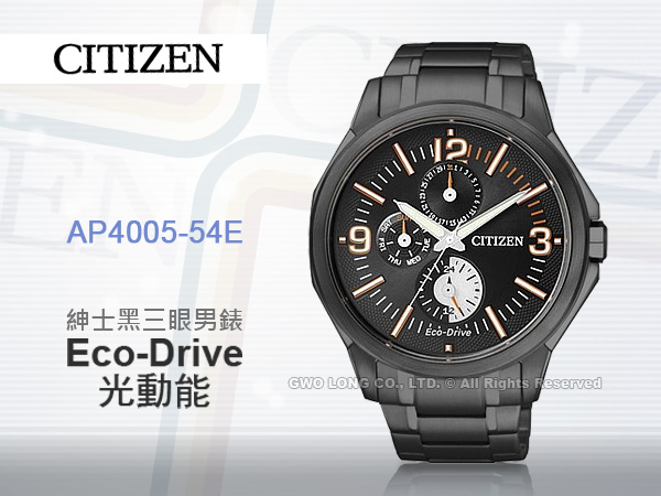AP4005-54E CITIZEN 三眼光動能男錶 不鏽鋼錶帶 黑色錶面 生活防水