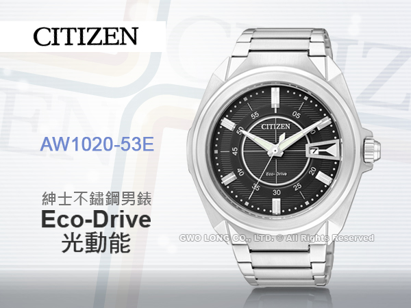 AW1020-53E CITIZEN 指針光動能男錶 不鏽鋼錶帶 黑色錶面 防水50米