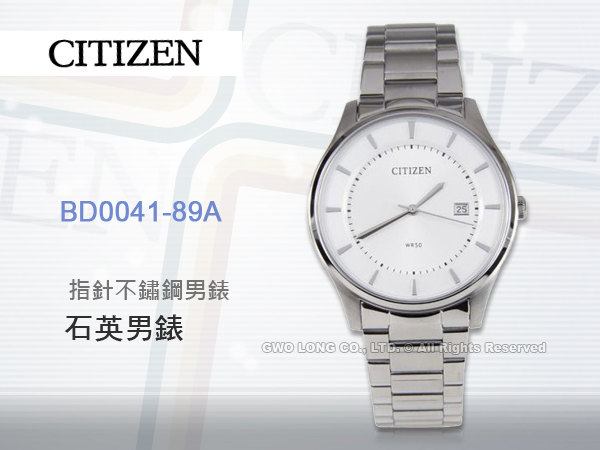 BD0041-89A CITIZEN 石英指針男錶 不鏽鋼錶帶 白色錶面 防水50米