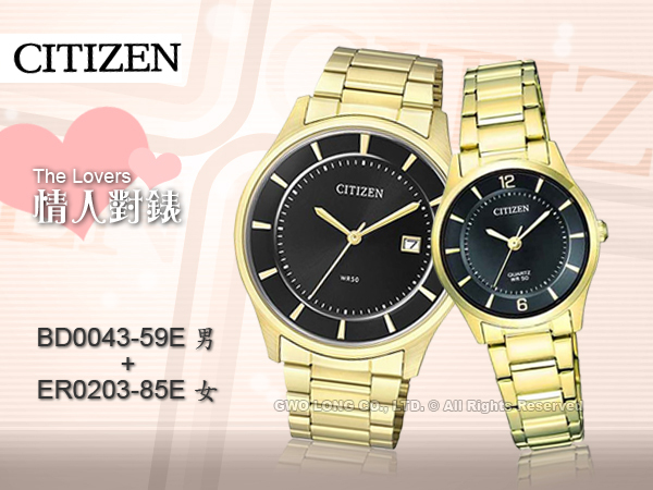 BD0043-59E+ER0203-85E CITIZEN 對錶 指針錶 日期顯示 生活防水 不鏽鋼錶帶