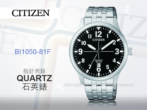BI1050-81F CITIZEN 石英指針男錶 不鏽鋼錶帶 黑色錶面 防水50米 日期顯示