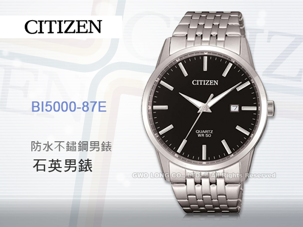 BI5000-87E CITIZEN 石英指針男錶 不鏽鋼錶帶 黑色錶面 日常生活防水 強化玻璃鏡面