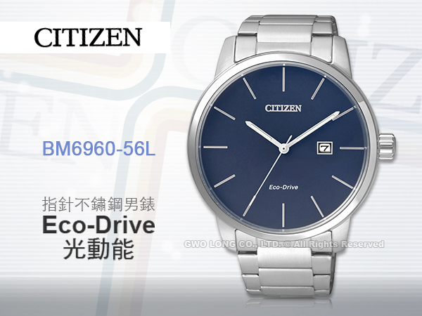 BM6960-56L CITIZEN 光動能男錶 不鏽鋼錶帶 藍色錶面 防水50米 日期顯示