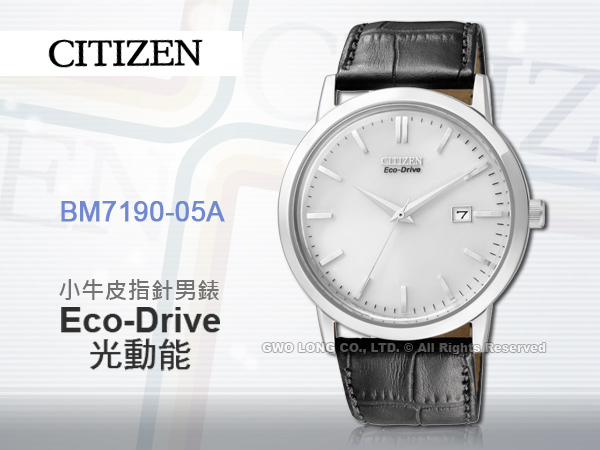 BM7190-05A CITIZEN 光動能男錶 皮革錶帶 白色錶面 水晶玻璃鏡面 日期顯示