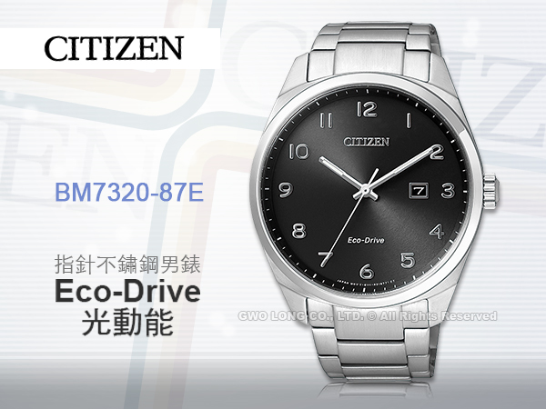 BM7320-87E CITIZEN 光動能男錶 不鏽鋼錶帶 黑色錶面 日常生活防水 日期顯示