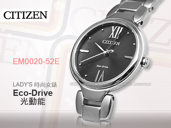 EM0020-52E CITIZEN 光動能指針女錶 不鏽鋼錶帶 黑色錶面 防水50米