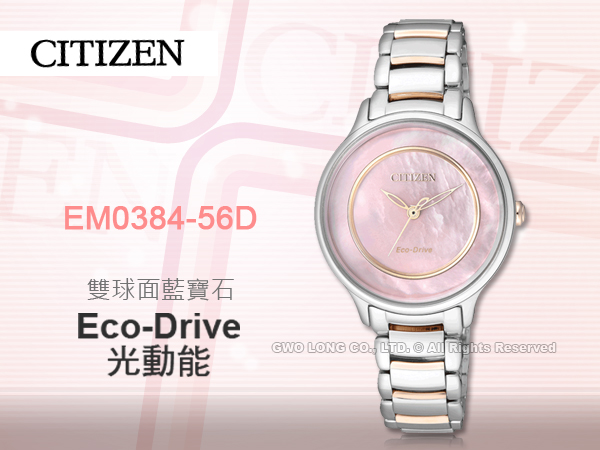 EM0384-56D CITIZEN 光動能指針女錶 不鏽鋼錶帶 粉色錶面 藍寶石玻璃鏡面 防水50米
