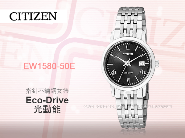 EW1580-50E CITIZEN 光動能指針女錶 不銹鋼錶帶 黑面 藍寶石水晶玻璃鏡面 防水100米 日期