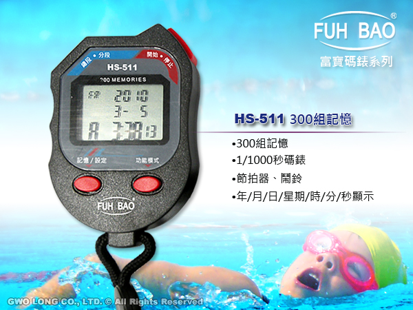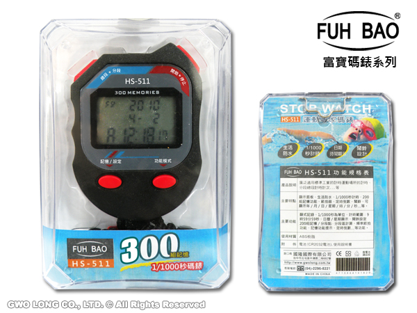 HS-511 FUH BAO 碼錶 300組記憶 鬧鈴 節拍器 日曆 星期顯示