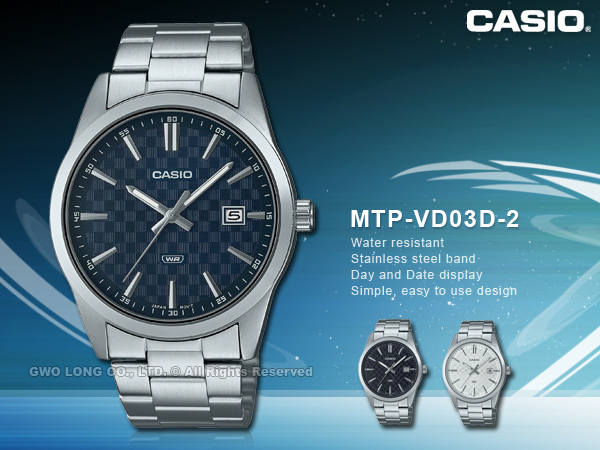 MTP-VD03D-2 CASIO 男錶 簡約指針錶 不鏽鋼錶帶 藍面 日期顯示 生活防水 MTP-VD03