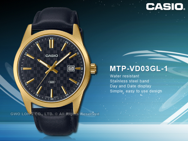 MTP-VD03GL-1 CASIO 男錶 簡約指針錶 皮革錶帶 黑面 日期顯示 生活防水 MTP-VD03
