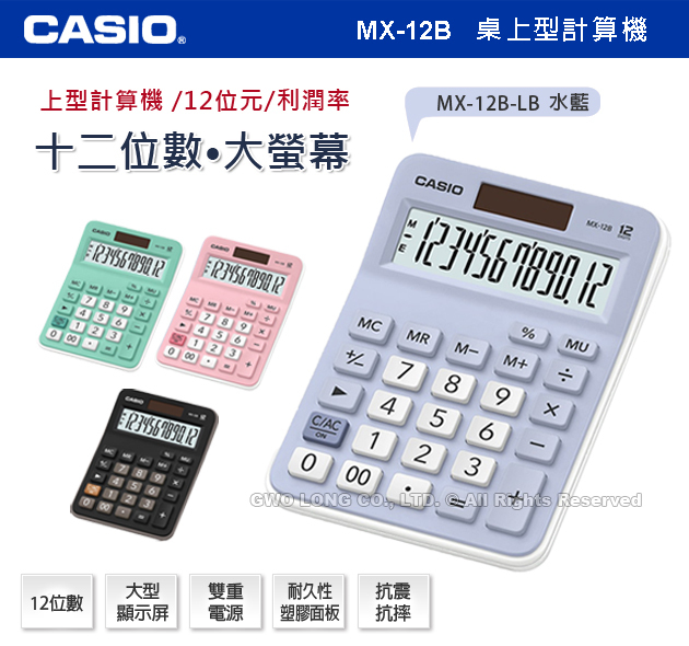 MX-12B CASIO 桌上型計算機 MX-12B-LB 水藍色 12位數 利潤率 正負轉換小數位選擇器