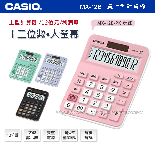 MX-12B CASIO 桌上型計算機 MX-12B-PK 粉紅色 12位數 利潤率 正負轉換小數位選擇器