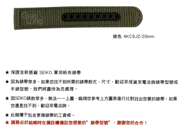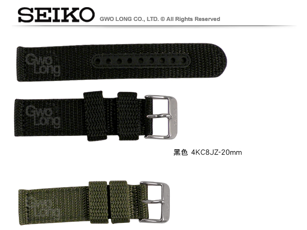 SEIKO 20mm 軍用帆布錶帶 綠色 4KC9JZ, 黑色4KC8JZ