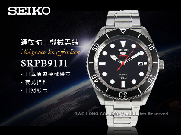 SRPB91J1 SEIKO 日製運動機械男錶 不鏽鋼錶帶 黑 防水100米