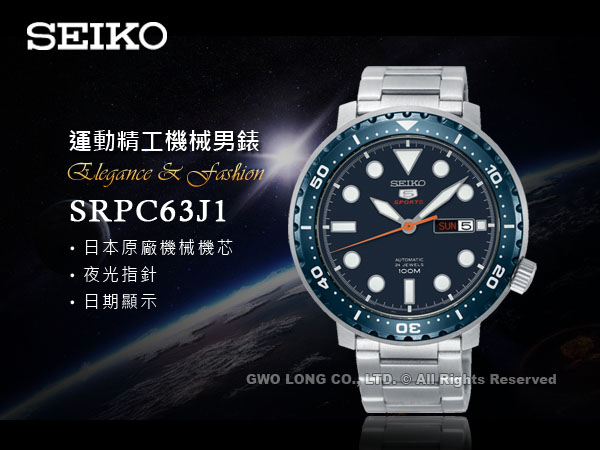 SRPC63J1 SEIKO 日製運動機械男錶 不鏽鋼錶帶 湖藍 防水100米