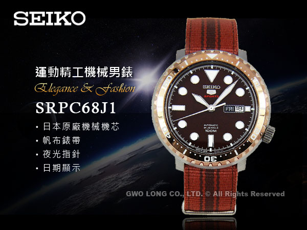 SRPC68J1 SEIKO 運動機械男錶 帆布錶帶 咖啡X金 防水100米