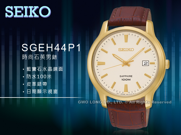 SGEH44P1 SEIKO 石英男錶 皮革錶帶 金色錶盤 藍寶石水晶鏡面