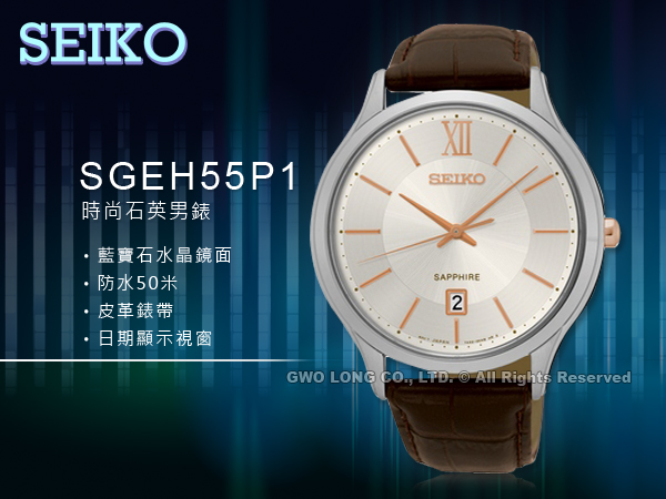 SGEH55P1 SEIKO 紳士石英男錶 皮革錶帶 藍寶石水晶鏡面 防水50米 銀白色錶面