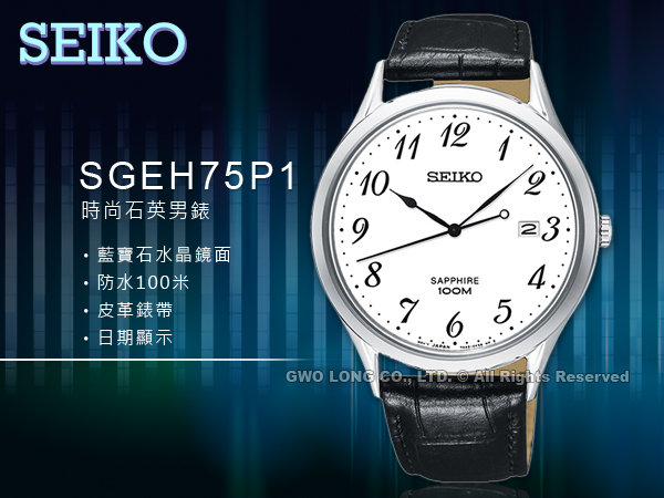 SGEH75P1 SEIKO 時尚石英男錶 皮革錶帶 藍寶石水晶 白色錶盤