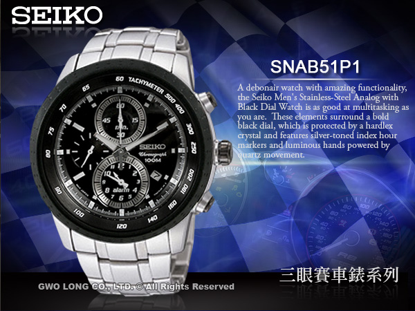 SNAB51P1 SEIKO 賽車三眼石英男錶 不鏽鋼錶帶 黑面 防水100米