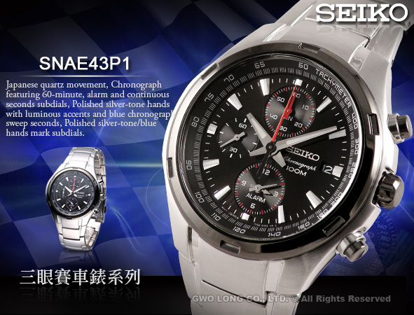 SNAE43P1 SEIKO 賽車三眼石英男錶 不鏽鋼錶帶 黑面 防水100米