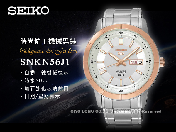 SNKN56J1 SEIKO 日製時尚男錶機械錶 不鏽鋼錶帶 日期顯示 日常生活防水 白x玫瑰金