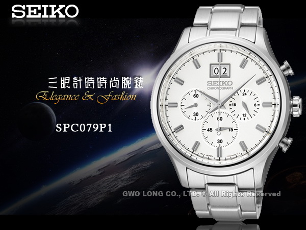 SPC079P1 SEIKO 大錶徑三眼計時男錶 不鏽鋼錶帶 日期顯示 防水100米 白面
