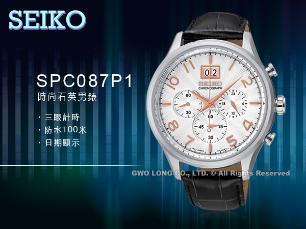 SPC087P1 SEIKO 時尚三眼石英男錶 皮革錶帶 白色x玫瑰金 防水100米 強化玻璃鏡面