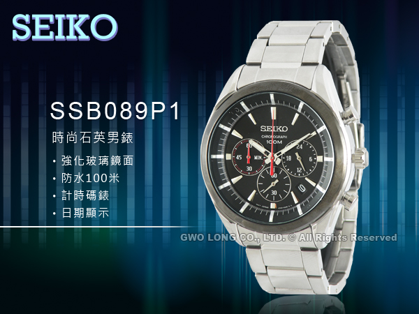 SSB089P1 SEIKO 時尚三眼男錶 不鏽鋼錶帶 黑面 防水200米