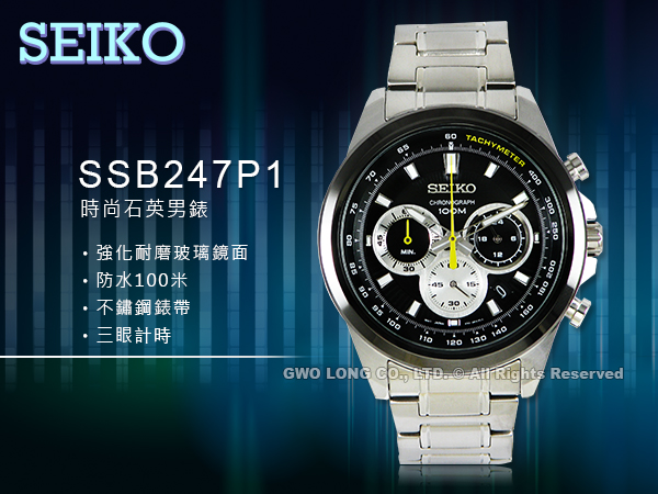 SSB247P1 SEIKO 時尚三眼石英男錶 不鏽鋼錶帶 日期顯示 防水100米 黑色錶面