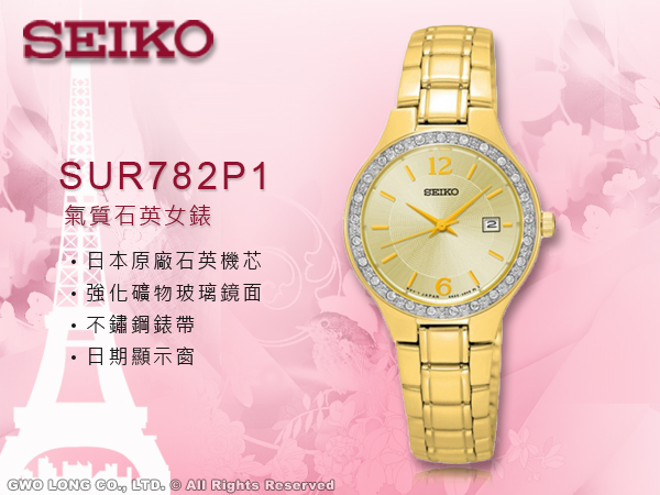 SUR782P1 SEIKO 氣質石英女錶 不鏽鋼錶帶 金色 晶鑽錶圈 防水30米